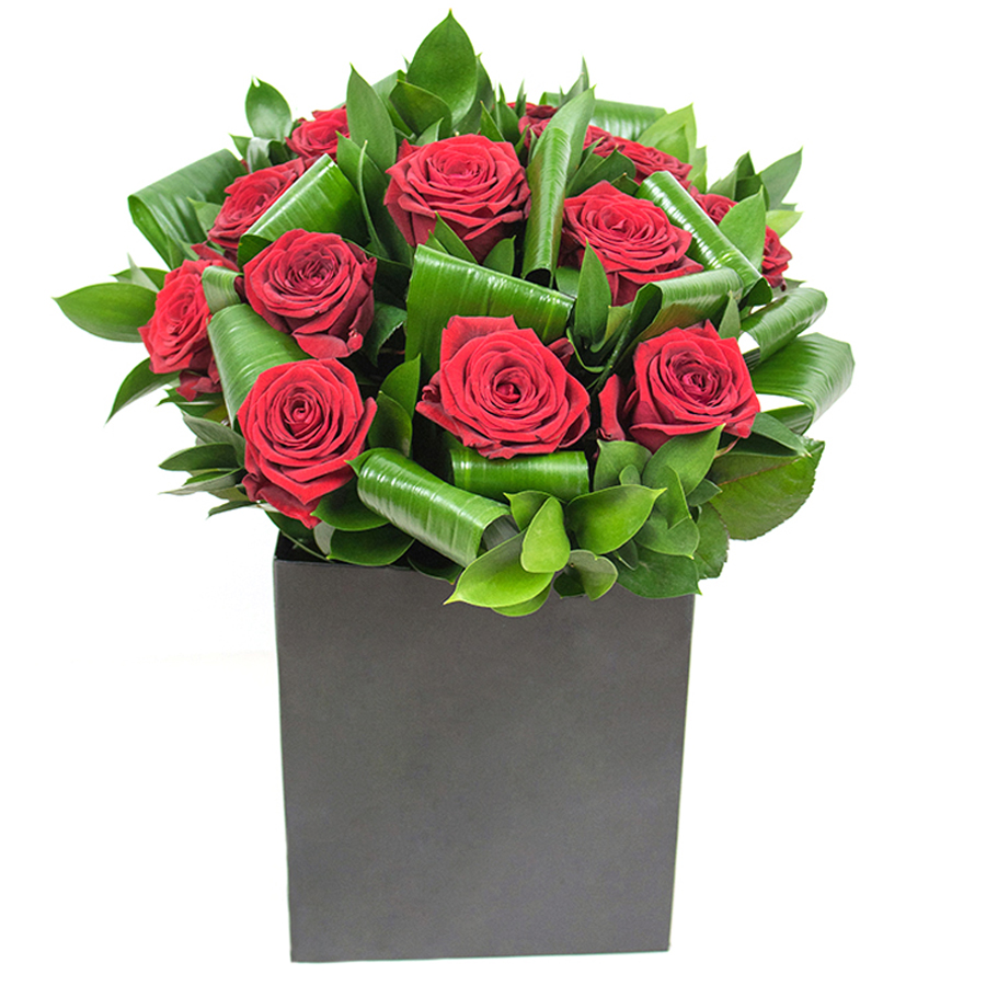 Celebrate love and sophistication with our carefully crafted bouquet that features dazzling red roses paired with lush aspidistra leaves and delicate ruscus. The arrangement’s rich hues and vibrant design evoke warmth and elegance, making it a perfect statement piece for any setting. Its beauty is elevated by the natural interplay of bold colors and gently cascading greenery.