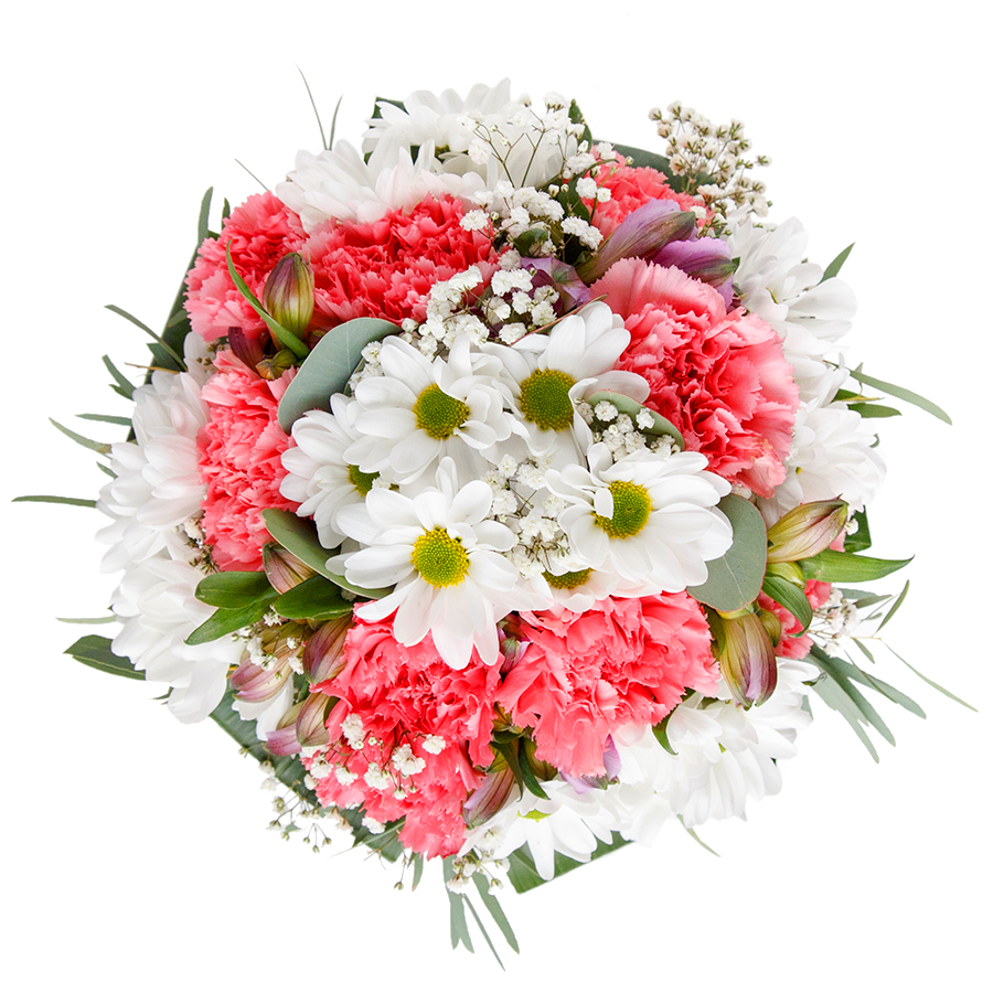 A truly sweet arrangement that will bring many smiles. Send this lovely seasonal mix of flowers and make someone day extra special. A soft colour palette of snow-white chrysanthemums and gypsophila, light pink carnations tightly wrapped in aspidistra leaves.